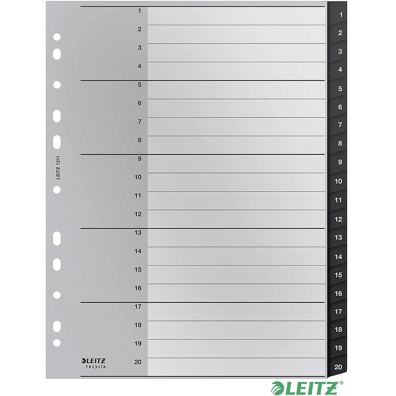 PRZEKŁADKI PP LEITZ RECYCLE CZARNE to szerokie przekładki PP RECYCLE MAXI z 20 indeksami, gwarantujące łatwy dostęp do dokumentów.